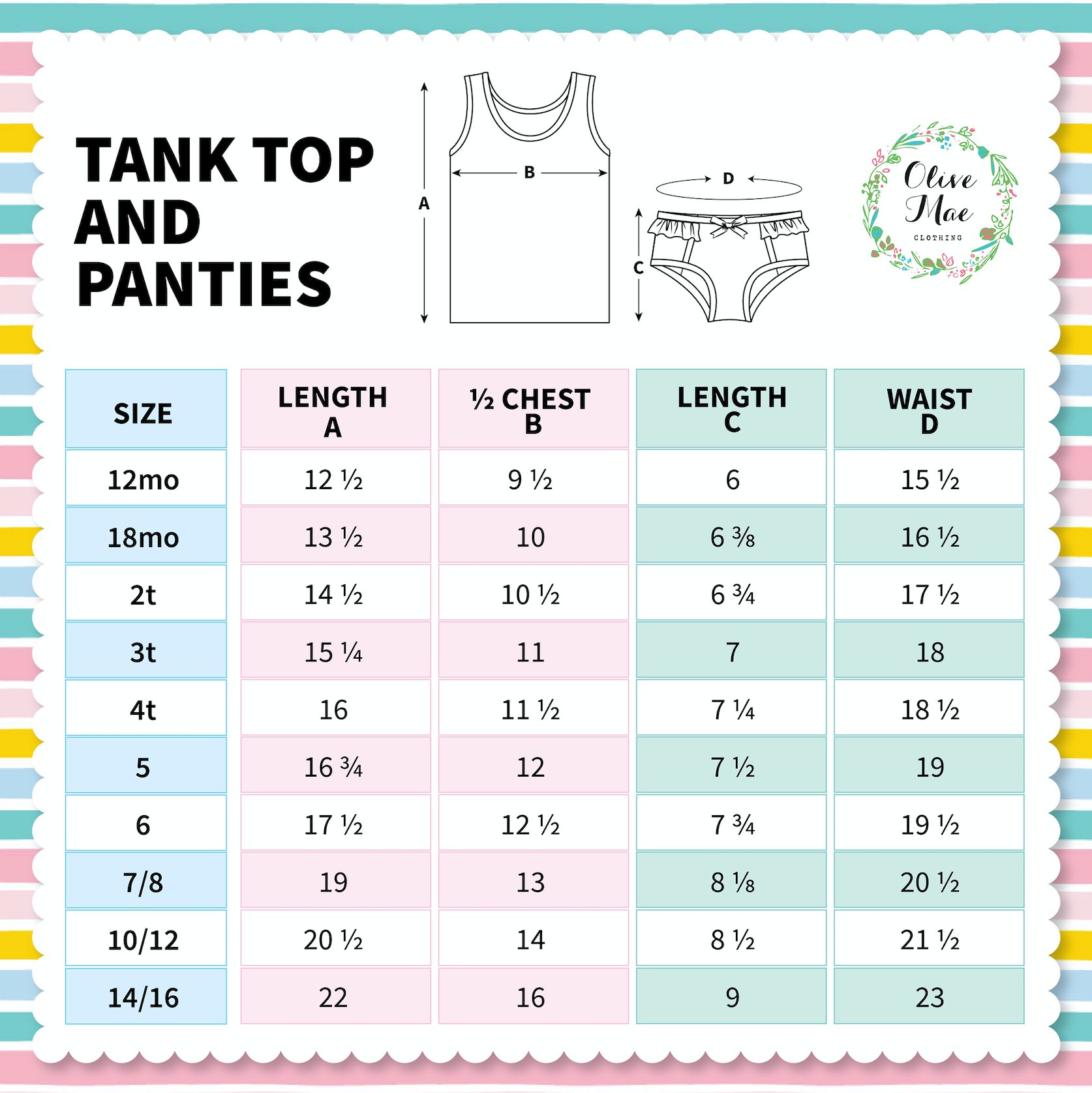 The Perfect Panty Set for your little girl. These panties and tank are super soft and so comfortable. These colors were picked to match so many Olive Mae Dresses and Lounge wear.
