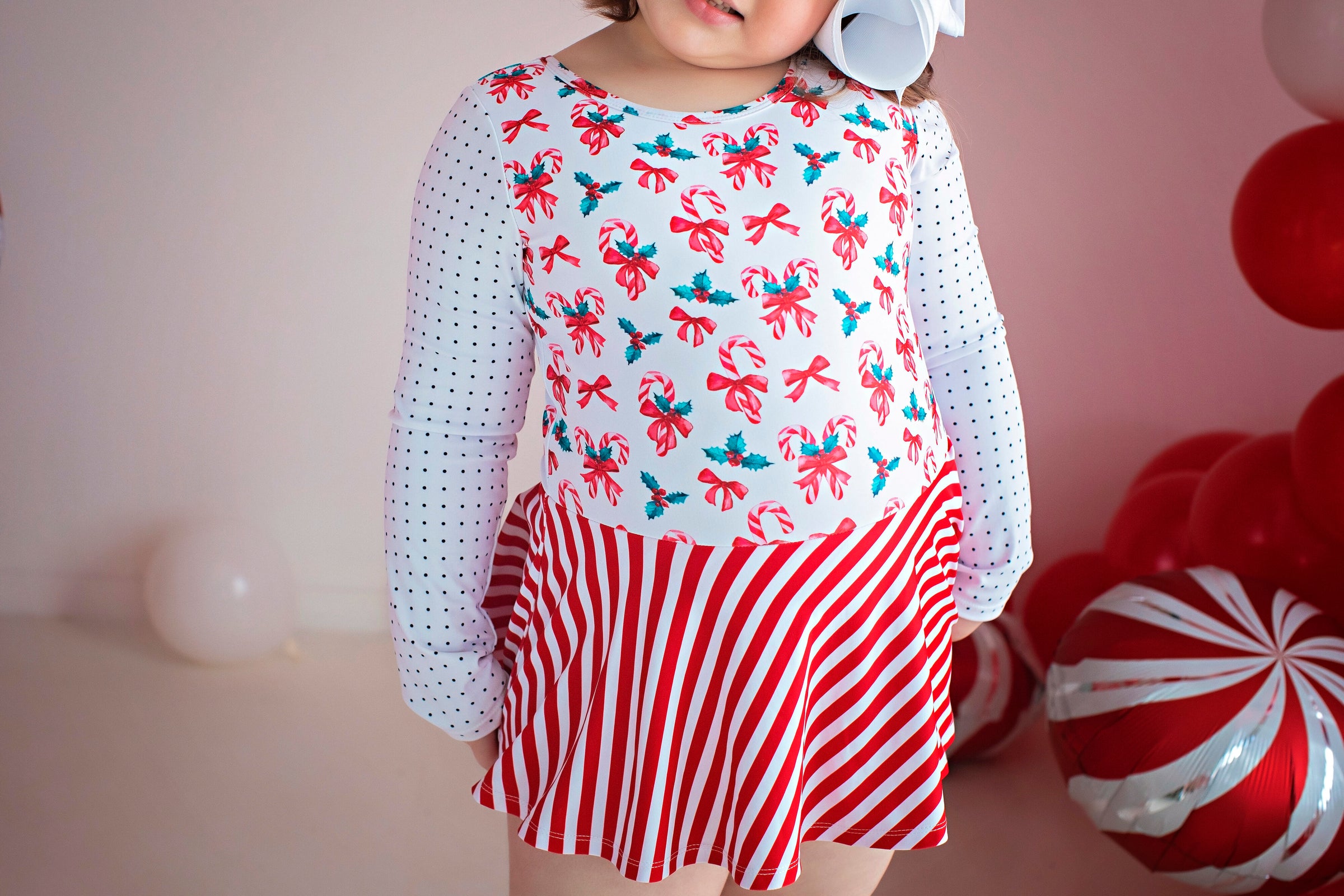 Candy Cane Leotard is soon to be a favorite this Christmas season. This leotard has a candy cane print on the bodice, attached stripe skirt and black polka dots on the sleeves.